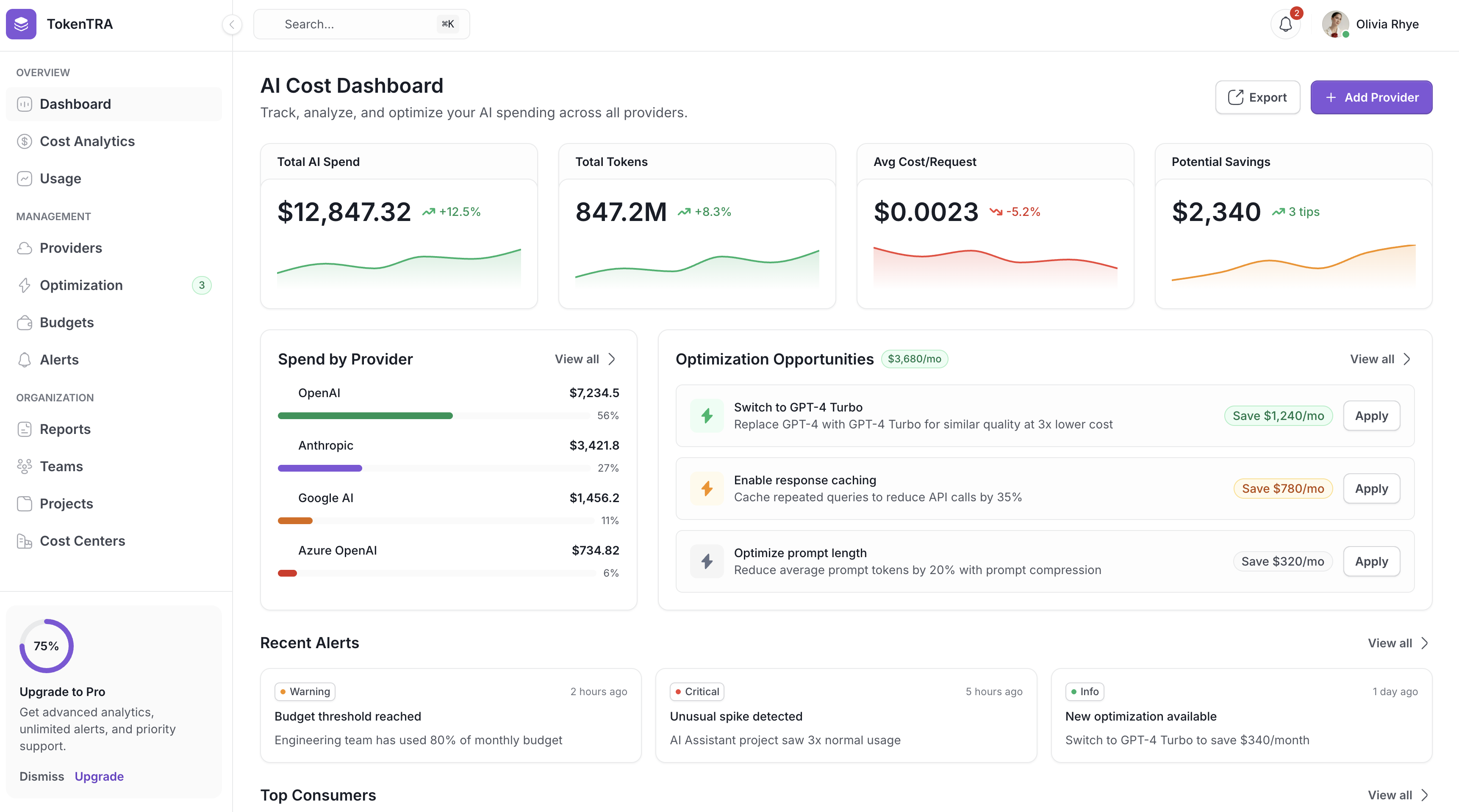 TokenTra is the command center for your AI spending. Connect all providers, see every dollar, optimize automatically. Setup takes 2 minutes.